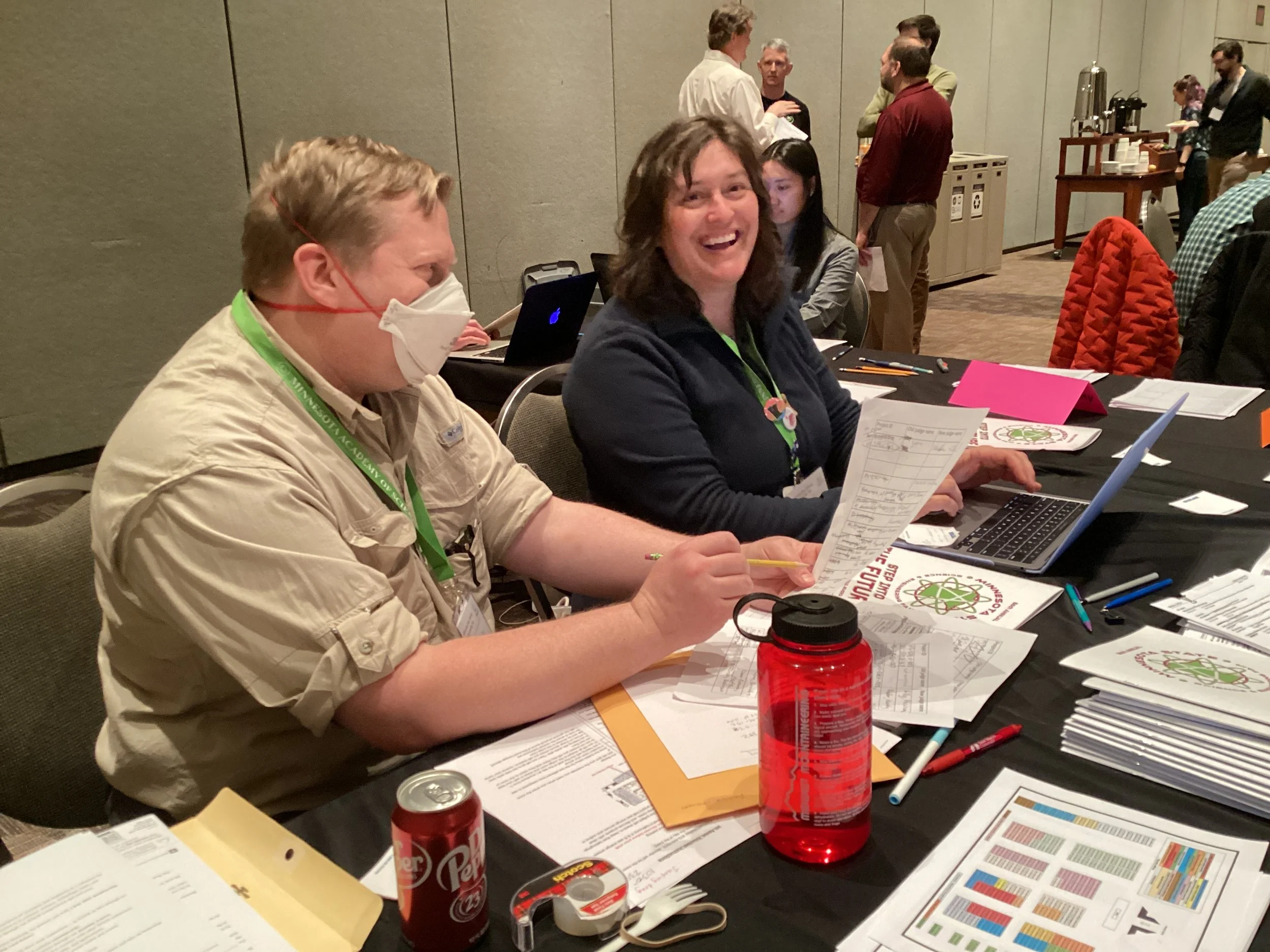 Jennifer greets volunteers at the 2023 Minnesota State Science Fair with her husband, Dustin (who is frequently found lending a hand at MAS events).